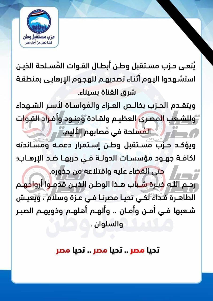 مستقبل وطن ينعى شهداء الوطن بحادث منطقة شرق القناة بسيناء«رحم الله خيرة شباب هذا الوطن ..وكل الدعم لمؤسسات الدولة حتى القضاء على الإرهاب»