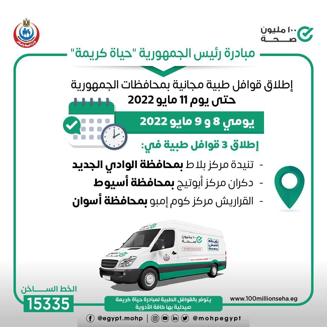 تطلق وزارة الصحة والسكان، اليوم الأحد، 3 قوافل طبية بالمحافظات، للكشف والعلاج المجاني للمواطنين، ضمن مبادرة رئيس الجمهورية عبد الفتاح السيسي «حياة كريمة»، تحت شعار «100 مليون صحة»، وتستهدف الوصول للقرى النائية والتي تعاني من نقص في بعص الخدمات الطبية والعلاجية.