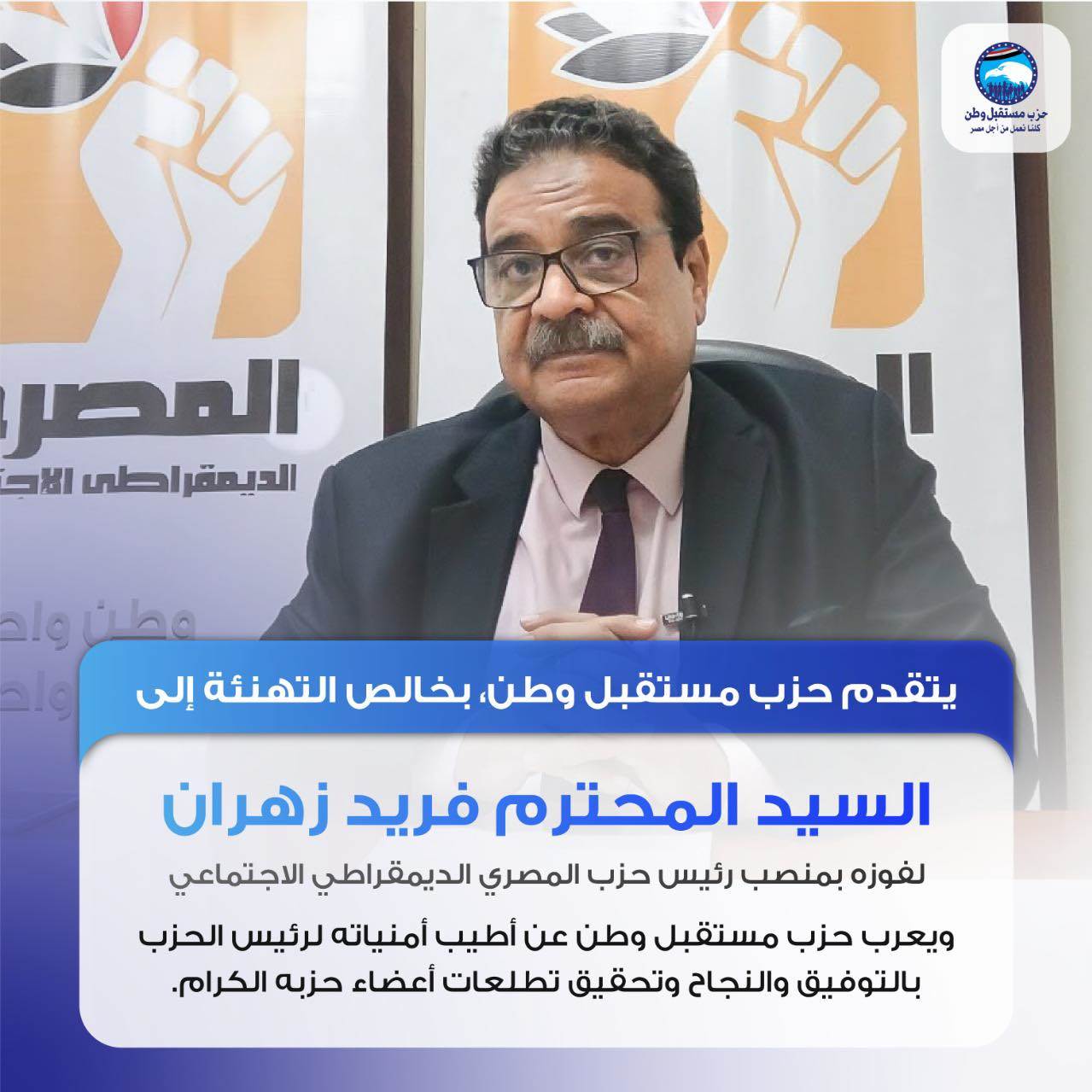 حزب مستقبل وطن يهنئ فريد زهران لفوزه برئاسة حزب المصري الديمقراطي الاجتماعي