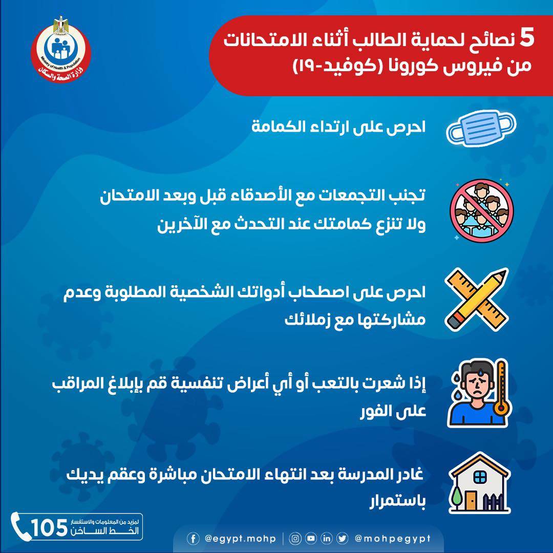 وجهت وزارة الصحة والسكان، اليوم الأحد، خلال منشور لها على صفحتها الرسمية على موقع التواصل الاجتماعي «فيس بوك»؛ عدة نصائح للطلاب؛ للوقاية من فيروس «كورونا» خلال فترة الامتحانات.