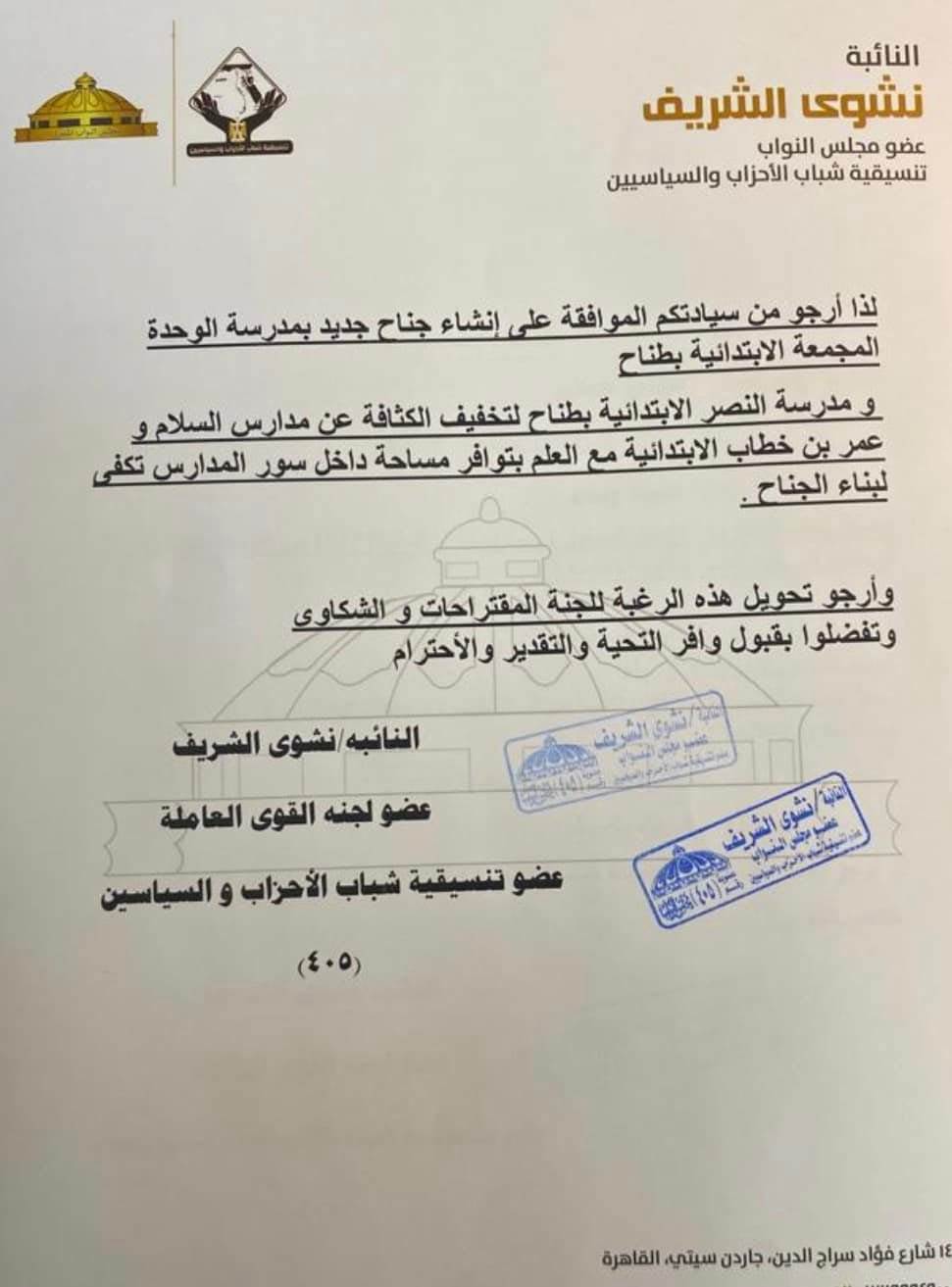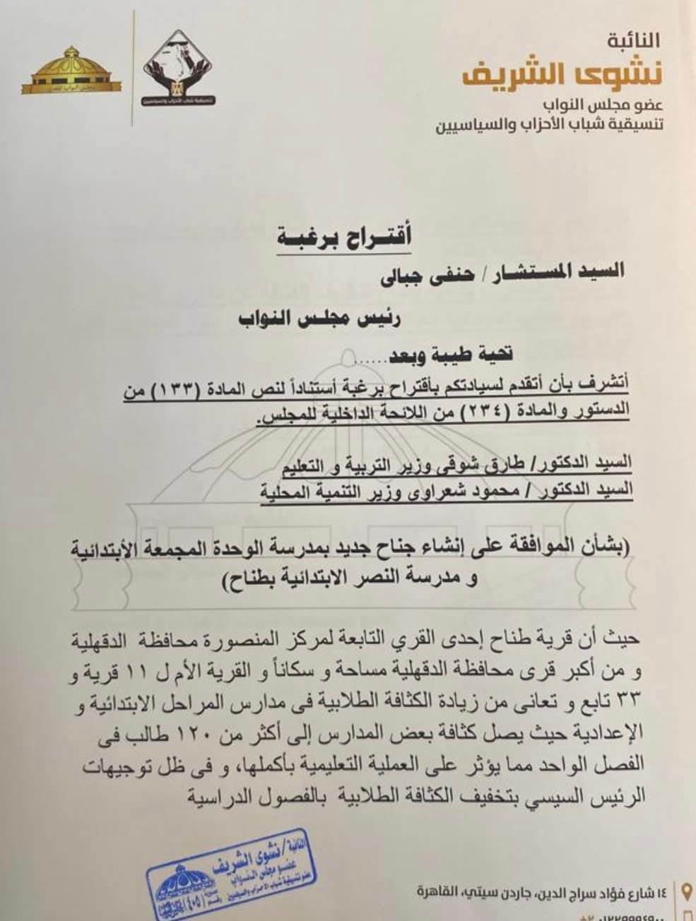 اقتراحات النواب تناقش مقترح نشوى الشريف لإنشاء جناح جديد بمدرستي الوحدة المجمعة والنصر الابتدائية بطناح بالدقهلية