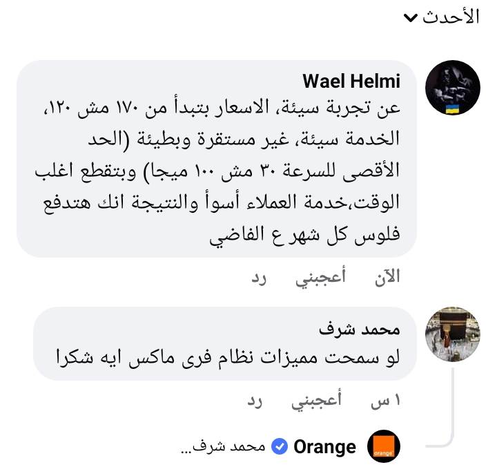 قال عميل أورنج عبر صفحة الرسمية على موقع "فيسبوك"، :"عن تجربة سيئة، الأسعار بتبدأ من ١٧٠ مش ١٢٠، الخدمة سيئة، غير مستقرة وبطيئة (الحد الأقصى للسرعة ٣٠ مش ١٠٠ ميجا) وبتقطع اغلب الوقت".