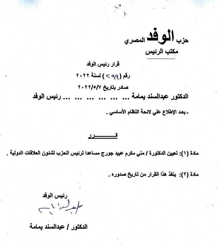 أصدر الدكتور عبد السند يمامة رئيس حزب الوفد قرارًا رقم 299 لسنة 2022 بتعيين الدكتورة منى مكرم عبيد جورج مساعدًا لرئيس الحزب لشئون العلاقات الدولية.
