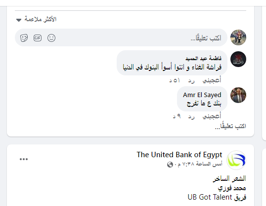 علق آحد العملاء على صفحة بنك المصرف المتحدة الرسمية عبر موقع "فيسبوك"، بأحد المنشورات، قائلا: "فراشة الغناء وانتوا أسوأ البنوك في الدنيا".