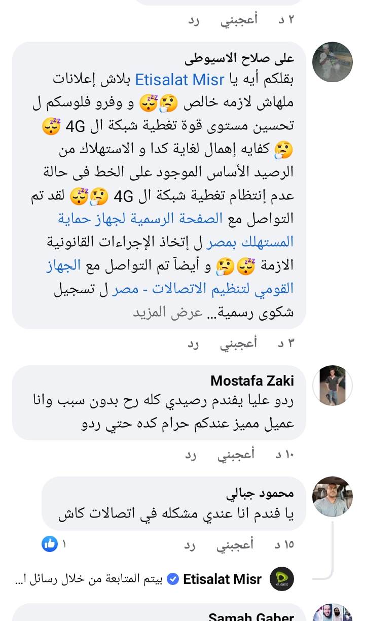 علق أحد عملاء اتصالات مصر عبر صفحة Etisalat Misr الرسمية على موقع "فيسبوك"، :"بقلكم أيه يا Etisalat Misr بلاش إعلانات ملهاش لازمه خالص، ووفرو فلوسكم لـ تحسين مستوى قوة تغطية شبكة الـ 4G كفاية إهمال لغاية كدا والاستهلاك من الرصيد الأساس الموجود على الخط فى حالة عدم إنتظام تغطية شبكة الـ 4G لقد تم التواصل مع الصفحة الرسمية لجهاز حماية المستهلك بمصر ل إتخاذ الإجراءات القانونية الأزمة وأيضآ تم التواصل مع الجهاز القومي لتنظيم الاتصالات - مصر لـ تسجيل شكوى رسمية بخصوص هذه المشكلة".