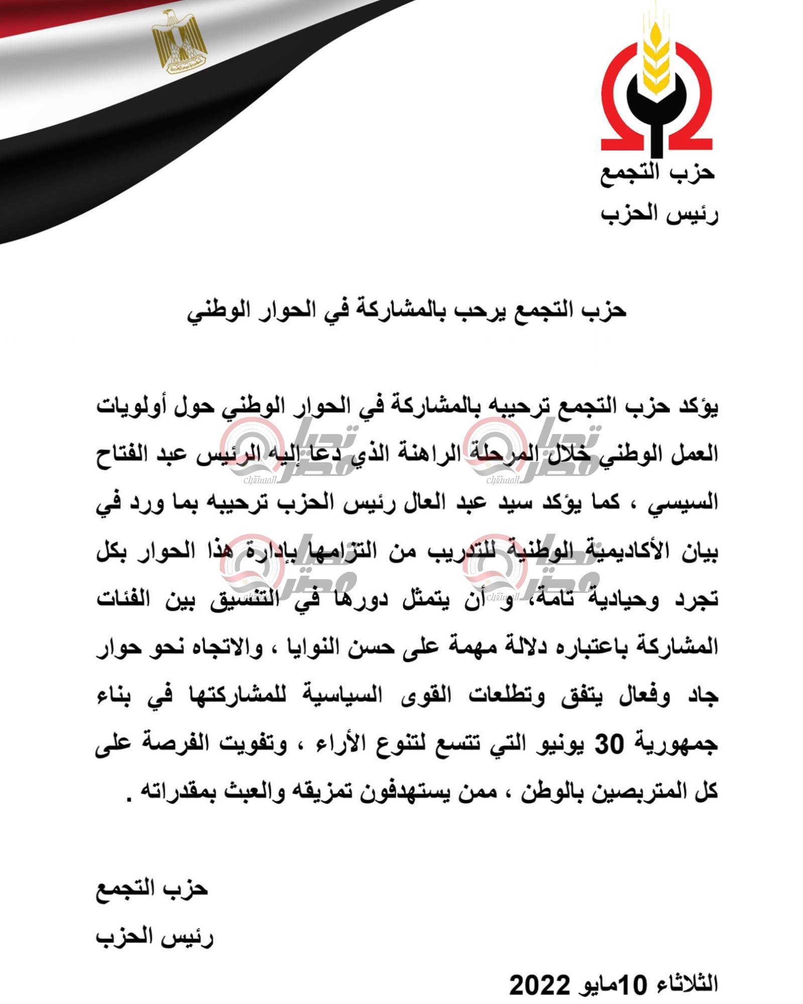 أكد حزب التجمع ترحيبه بالمشاركة في الحوار الوطني حول أولويات العمل الوطني خلال المرحلة الراهنةالذي دعا إليه الرئيس عبد الفتاح السيسي.