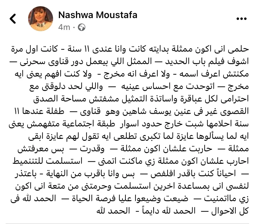 نشرت الفنانة نشوى مصطفى بوست مثير للجدل عبر صفحتها الرسمية بموقع التواصل الاجتماعي “فيسبوك”، كتبت به: “حلمى إني أكون ممثلة بدايته كانت وأنا عندي ١١ سنة ، كانت أول مرة أشوف فيلم باب الحديد الممثل اللي بيعمل دور قناوي سحرني مكنتش اعرف اسمه ولا اعرف إنه مخرج”.