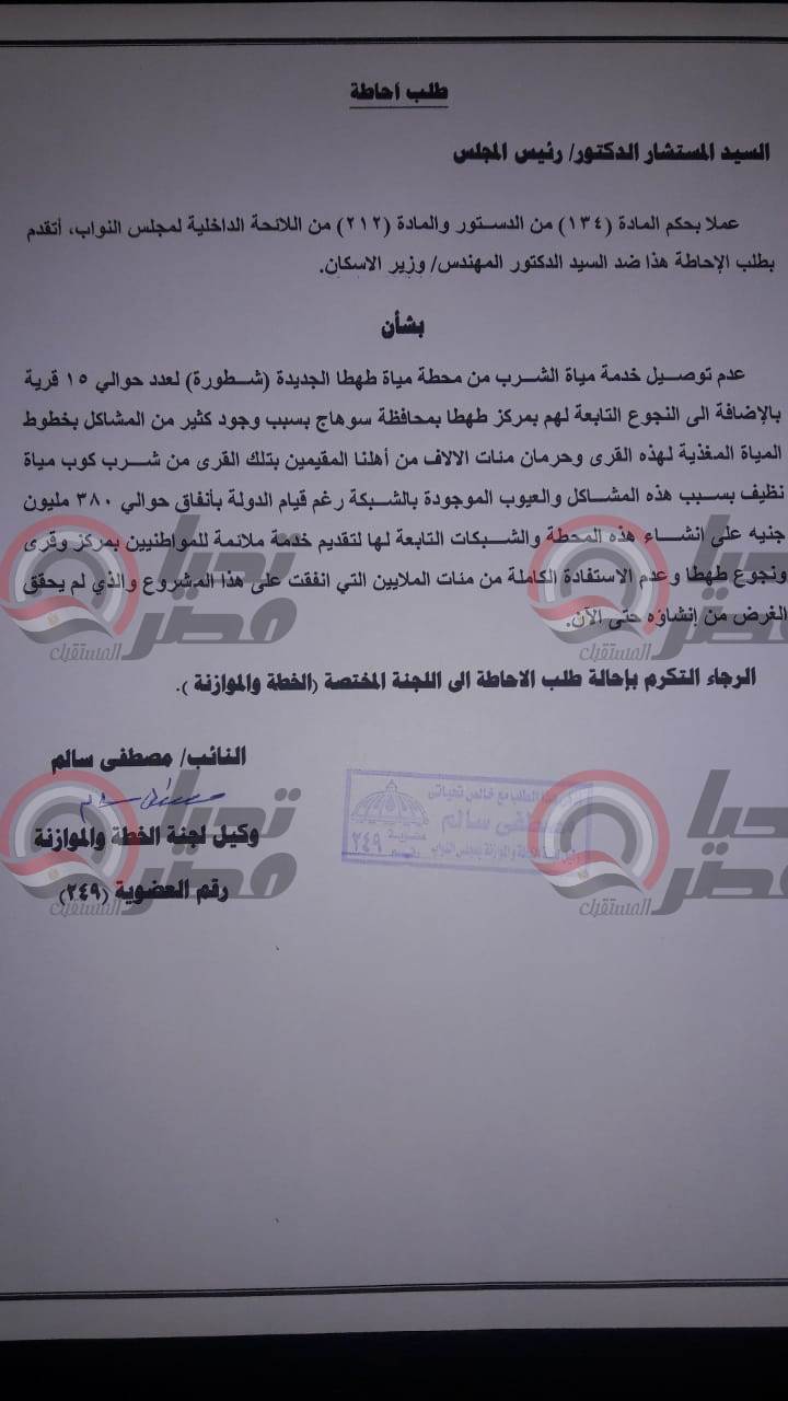تقدم النائب مصطفى سالم، وكيل لجنة الخطة والموازنة بمجلس النواب، نائب طهطا وطما وجهينة بسوهاج، بطلب إحاطة المستشار الدكتور حنفي جبالي رئيس مجلس النواب ضد الدكتور عاصم الجزار وزير الإسكان والمرافق والمجتمعات العمرانية، بشأن عدم توصيل خدمة مياة الشرب من محطة مياة طهطا الجديدة (شطورة ) لعدد 15 قرية بالإضافة إلى النجوع التابعة لهم وحرمان مئات الآلاف من الاهالى المقيمين بتلك القرى من خدمة توصيل مياة الشرب النظيفة و شرب كوب ماء نظيف بسبب وجود مشاكل وعيوب ببعض الخطوط بالشبكة رغم أنفاق الدولة حوالى 380 مليون جنية على أنشاء هذة المحطة والشبكات التابعة لها لتقديم خدمة ملائمة للمواطنين بمراكز وقرى ونجوع طهطا.