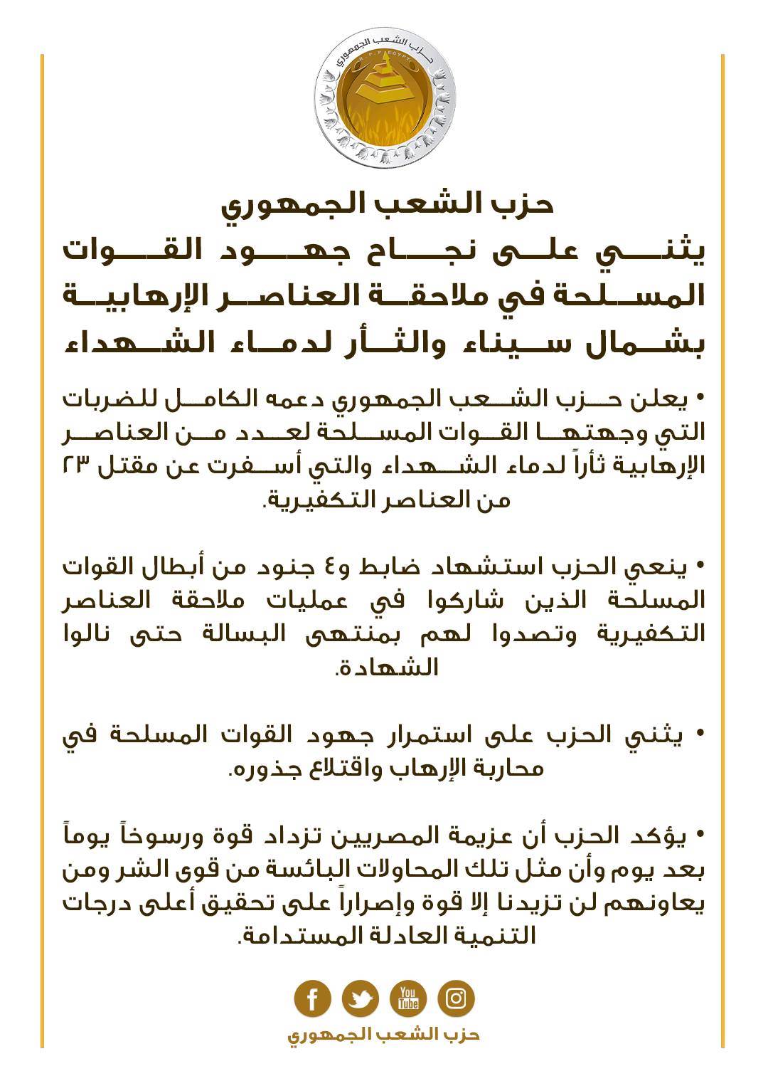 وأعلن حـزب الشعب الجمهوري، دعمه الكامـل للضربات التي وجهتهـا القـوات المسلحة لعـدد مـن العناصـر الإرهابية ثارا لدماء الشهداء والتي أسفرت عن مقتل ٢٣ من العناصر التكفيرية .