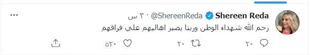 وغردت شيرين رضا عبر تويتر: رحم الله شهداء الوطن وربنا يصبر اهاليهم علي فراقهم، كما نعت الصحفية الراحلة شيرين أبو عاقلة، وكتبت: الله يرحمك #شيرين_ابو_عاقله.