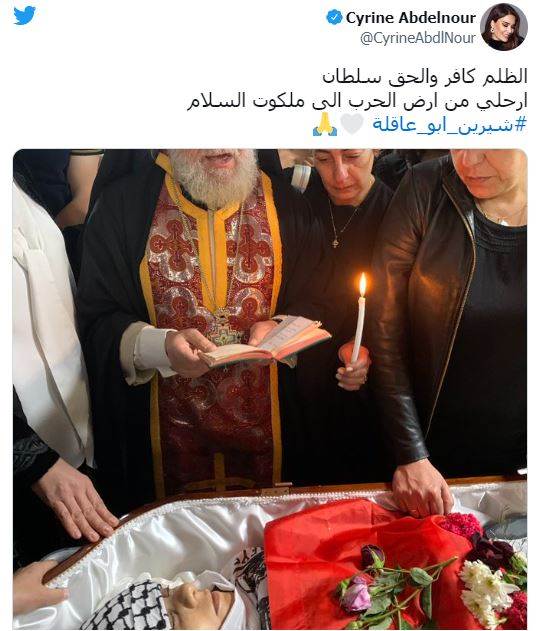 ونشرت سيرين عبد النور صورة من جنازة شيرين أبو عاقلة عبر صفحتها الرسمية وعلقت عليها قائلة: “الظلم كافر والحق سلطان ارحلي من ارض الحرب الى ملكوت السلام شيرين ابو عاقلة”.