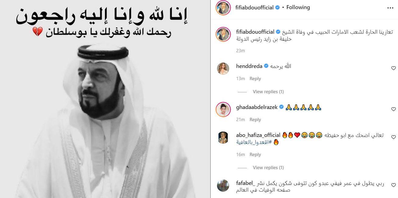 في حين كتبت الفنانة زينة: “البقاء والدوام لله تعازينا الحارة لشعب وحكومة الامارات في وفاة المغفور له باذن الله #الشيخ خليفةبن زايد”، وسبقتها فيفي عبده: “تعازينا الحارة لشعب الامارات الحبيب في وفاة الشيخ خليفة بن زايد رئيس الدولة”، وتفاعل معها الجمهور والمتابعين من خلال خاصية التعليقات التي تنعي الراحل ومنهم عدد من الفنانين والمشاهير مثل الفنانة غادة عبد الرازق والمذيعة والفنانة هند رضا.