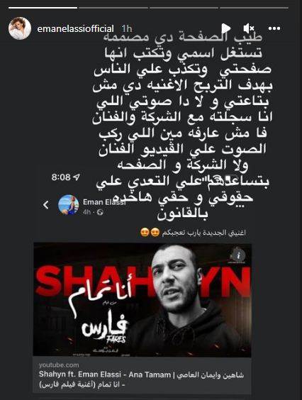 وكتبت إيمان العاصي في ستوري عبر صفحتها الرسمية بموقع التواصل الاجتماعي لتبادل الصور والفيديوهات انستجرام: “دي مش صفحتي ولا الأغنية دي تخصني خالص شكرًا”، وعادت لتطتب في ستوري أخرى: “طيب الصفحة دي مصممة تستغل اسمي وتكتب إنها صفحتي وتكذب على الناس بهدف التربح”.