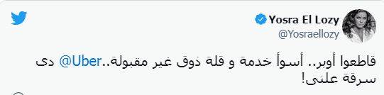 وكتبت يسرا اللوزي، عبر صفحتها الرسمية: «قاطعوا أوبر.. أسوأ خدمة و قلة ذوق غير مقبولة.. دى سرقة علني»، وتفاعل معها الجمهور والمتابعين من خلال التعليقات التي جاء البعض يؤيدها والبعض الآخر يدافع عن الشركة.