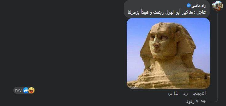 وجاءت العديد من التعليقات الأخرى الساخرة، فكان أحد التعليقات يقول: عاجل : “مناخير أبو الهول رجعت و هيبدأ يزمرلنا”، وتعليق قال: “حال اجدادنا دلوقتي”، وتعليق محتواه: “ابو الهول انت نمت؟”.