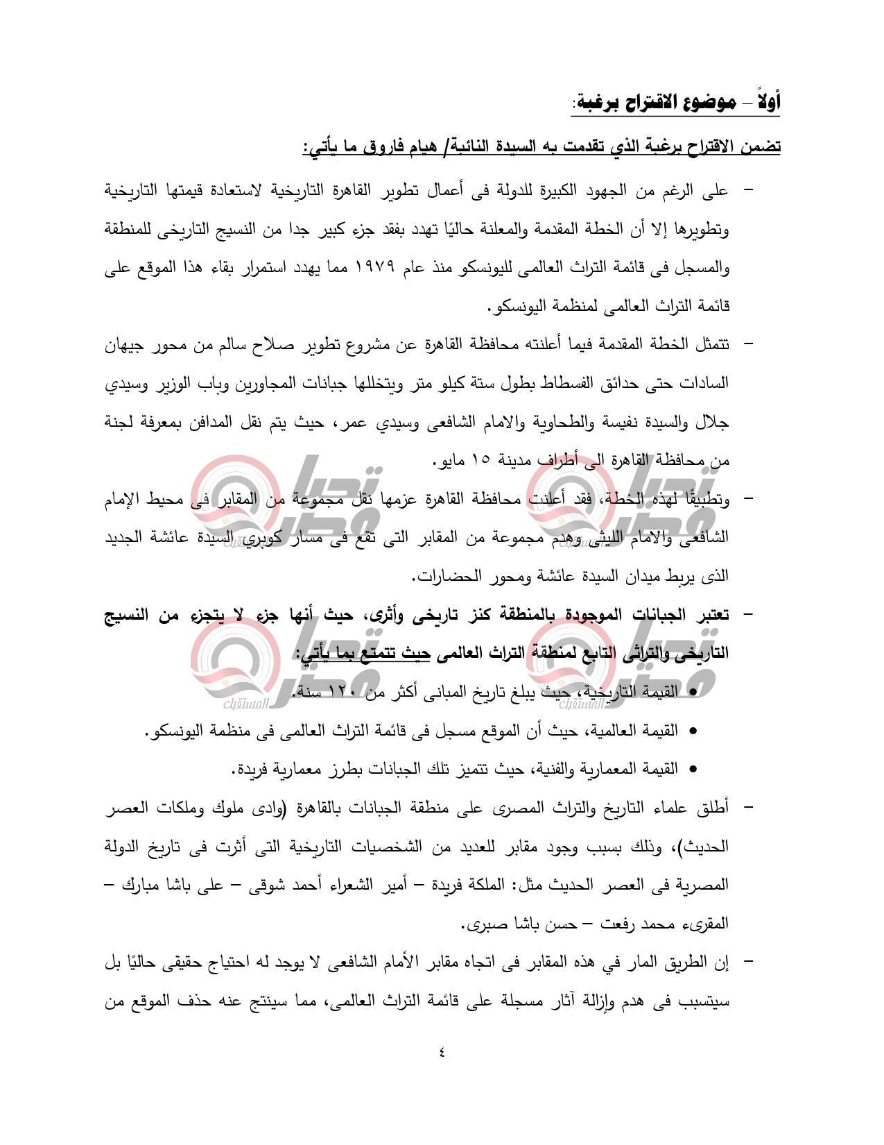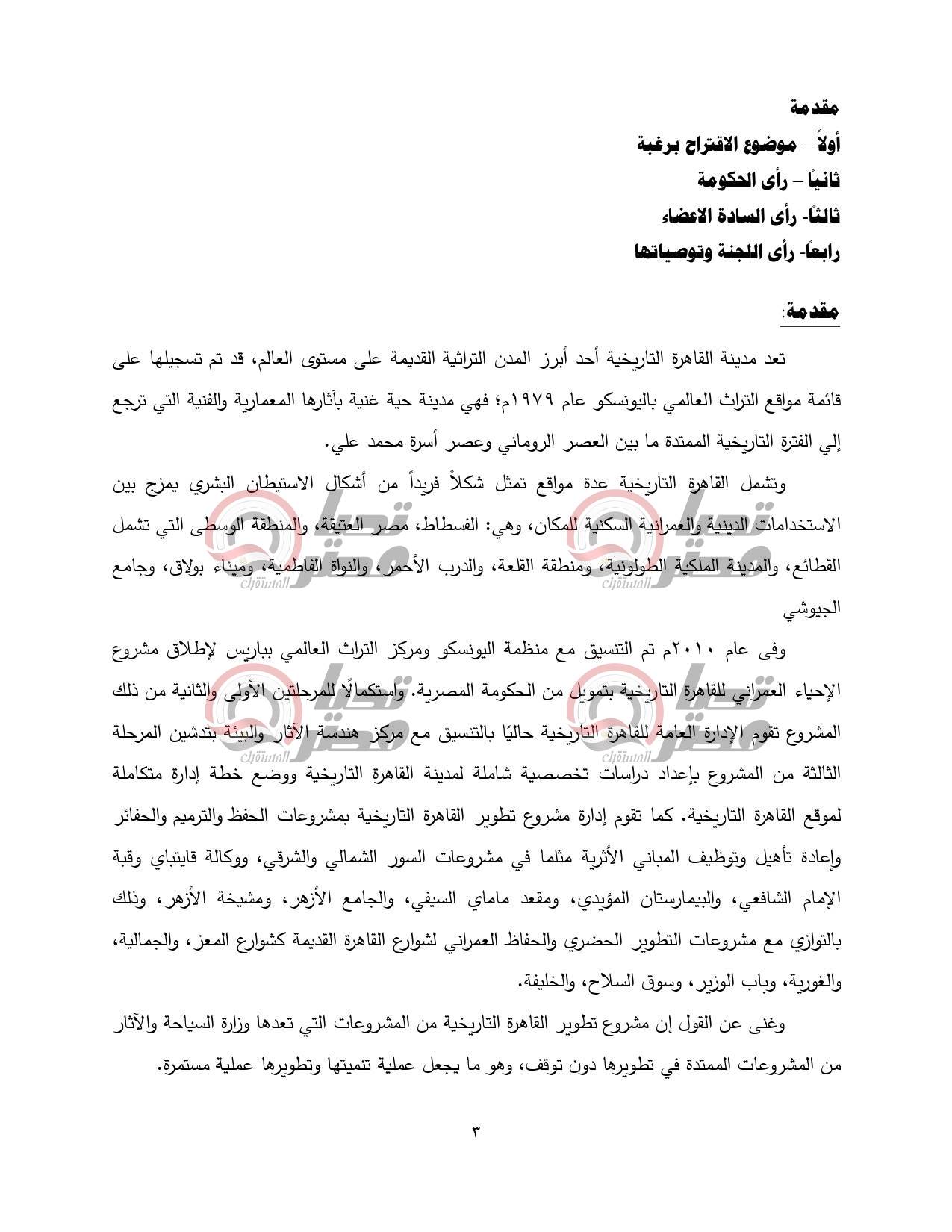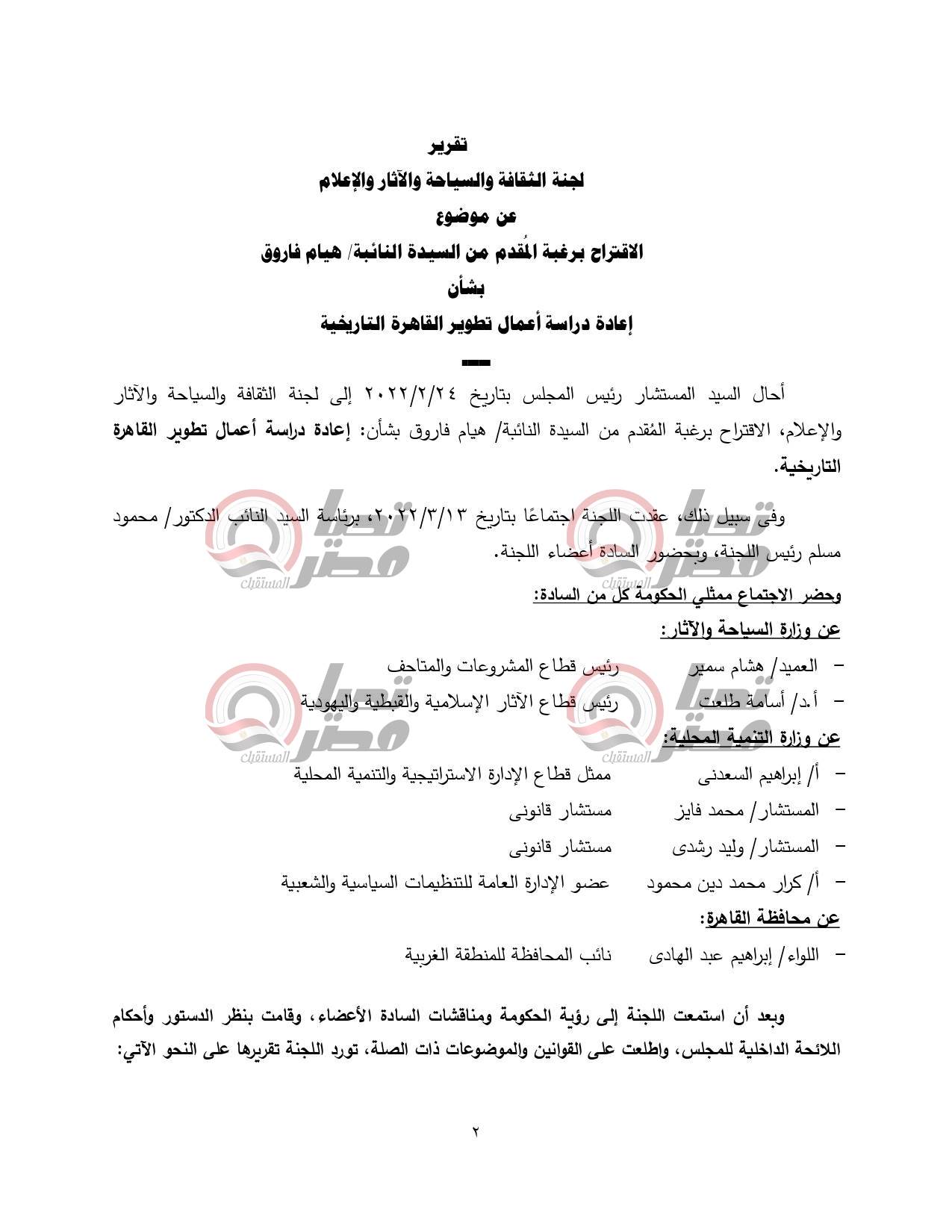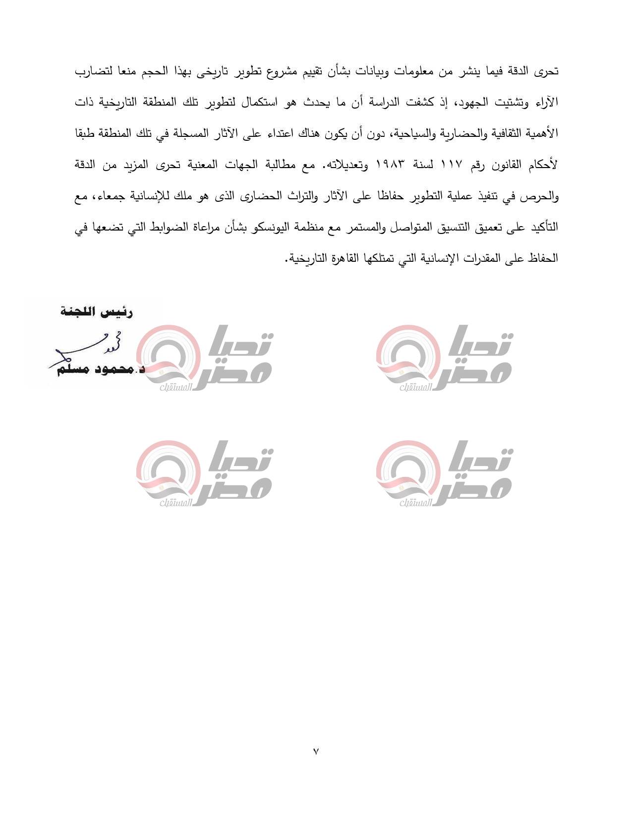انتهت اللجنة إلى أهمية الاقتراح برغبة التي تتمحور فكرته حول أهمية حماية القاهرة التاريخية ايقونة الحضارة الحديثة في الدولة المصرية، ولكن من الأهمية بمكانتحرى الدقة فيما ينشر من معلومات وبيانات بشأن تقييم مشروع تطویر تاریخی بهذا الحجم منعا لتضارب الآراء وتشتيت الجهود، إذ كشفت الدراسة أن ما يحدث هو استكمال لتطوير تلك المنطقة التاريخية ذات الأهمية الثقافية والحضارية والسياحية، دون أن يكون هناك اعتداء على الآثار المسجلة في تلك المنطقة طبقا لأحكام القانون رقم 117 لسنة 1983 وتعديلاته.