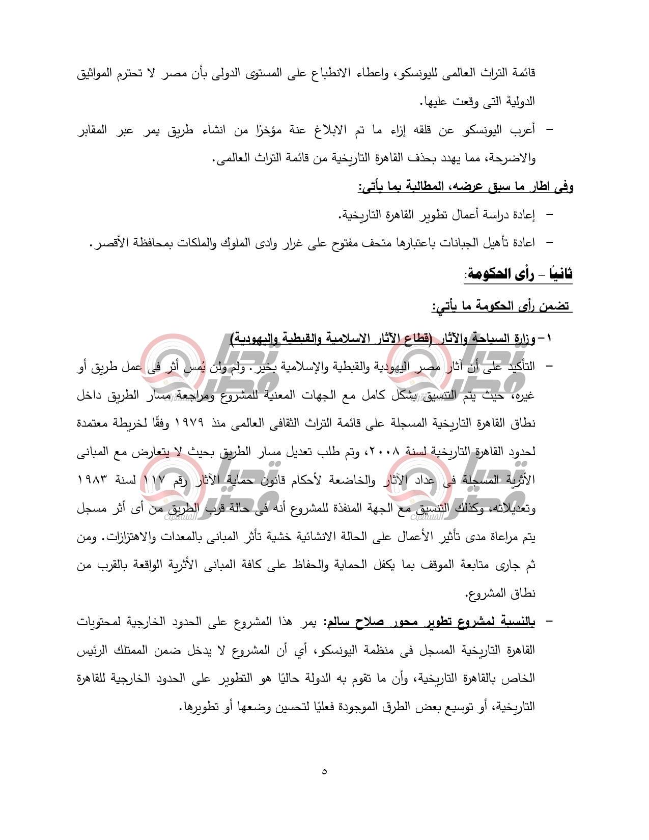 وأوضحت أن طلب تعديل مسار الطريق بحيث لا يتعارض مع المباني الأثرية المسجلة في عداد الآثار والخاضعة لأحكام قانون حماية الآثار رقم 117 لسنة 1983 وتعديلاته، وكذلك التنسيق مع الجهة المنفذة للمشروع أنه في حالة قرب الطريق من أي أثر مسجل يتم مراعاة مدى تأثير الأعمال على الحالة الانشائية خشية تأثر المباني بالمعدات والاهتزازات. ومن ثم جارى متابعة الموقف بما يكفل الحماية والحفاظ على كافة المباني الأثرية الواقعة بالقرب من نطاق المشروع.