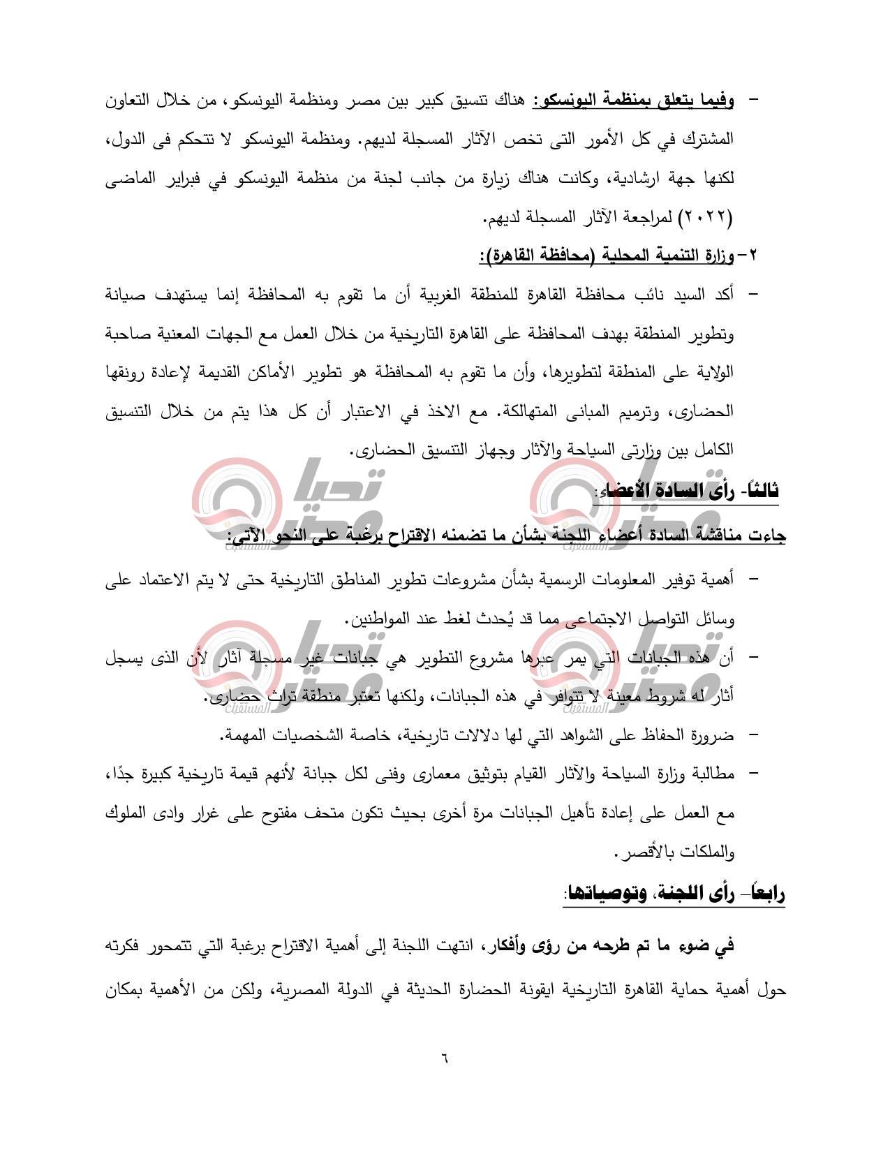 وطالبت اللجنة الجهات المعنية تحرى المزيد من الدقة والحرص في تنفيذ عملية التطوير حفاظا على الآثار والتراث الحضاري الذي هو ملك للإنسانية جمعاء، مع التأكيد على تعميق التنسيق المتواصل والمستمر مع منظمة اليونسكو بشأن مراعاة الضوابط التي تضعها في الحفاظ على المقدرات الإنسانية التي تمتلكها القاهرة التاريخية.