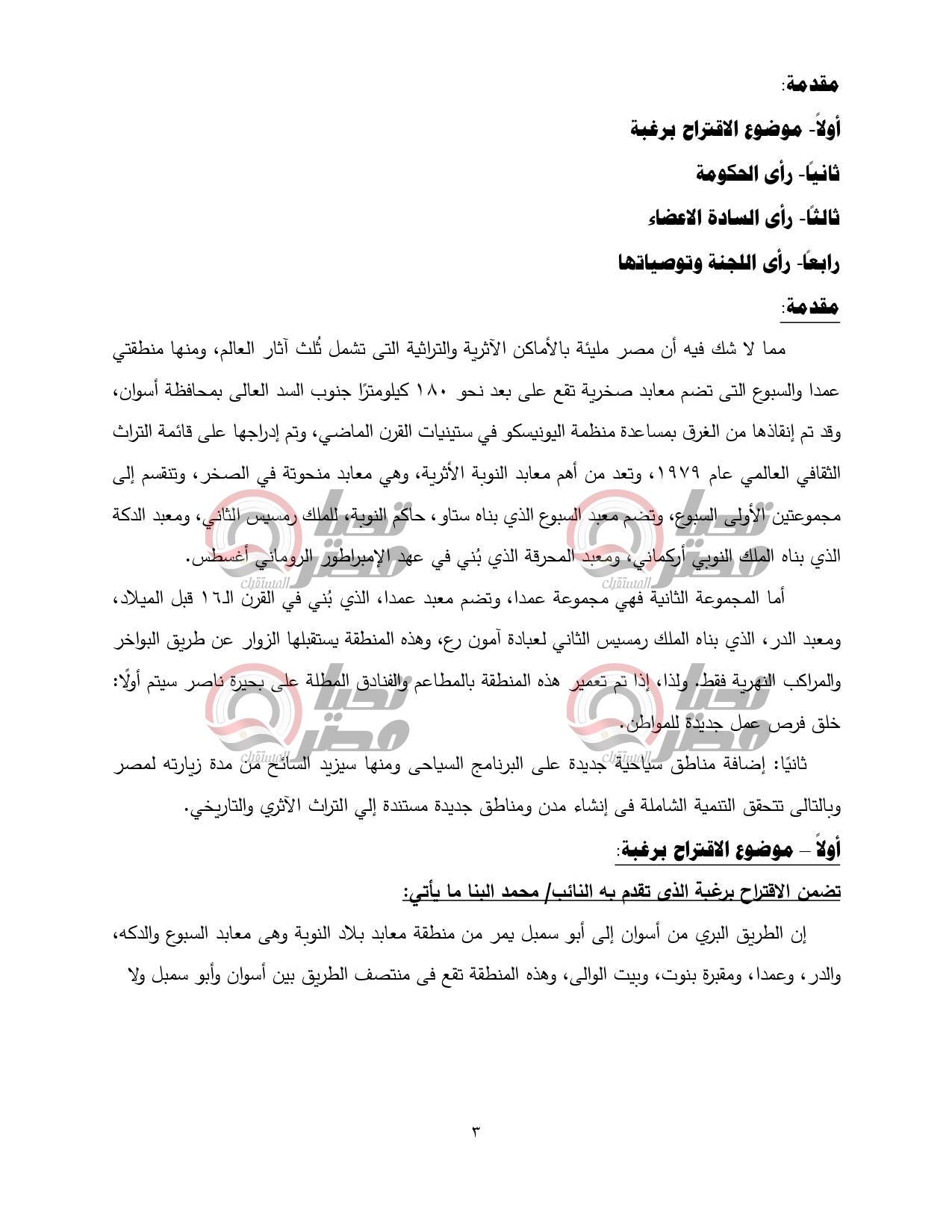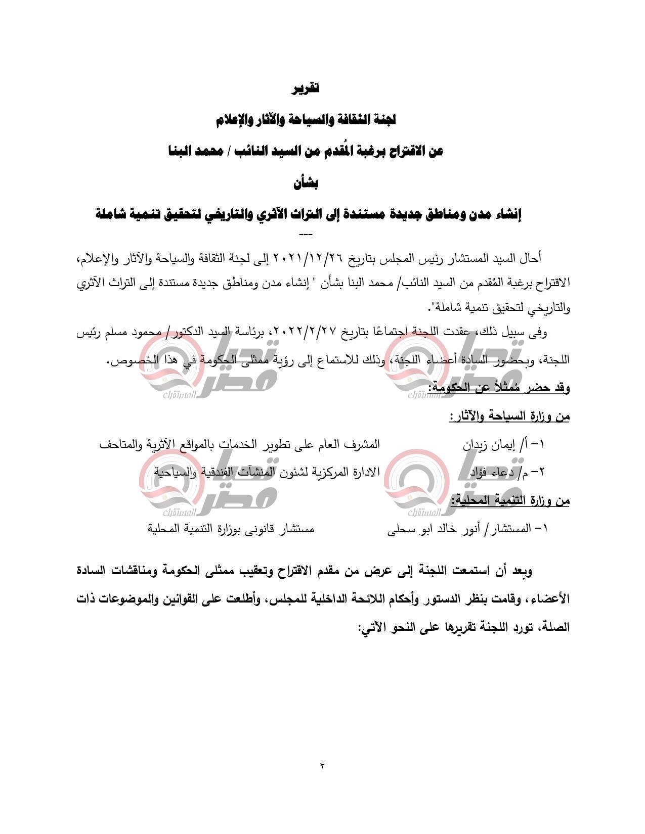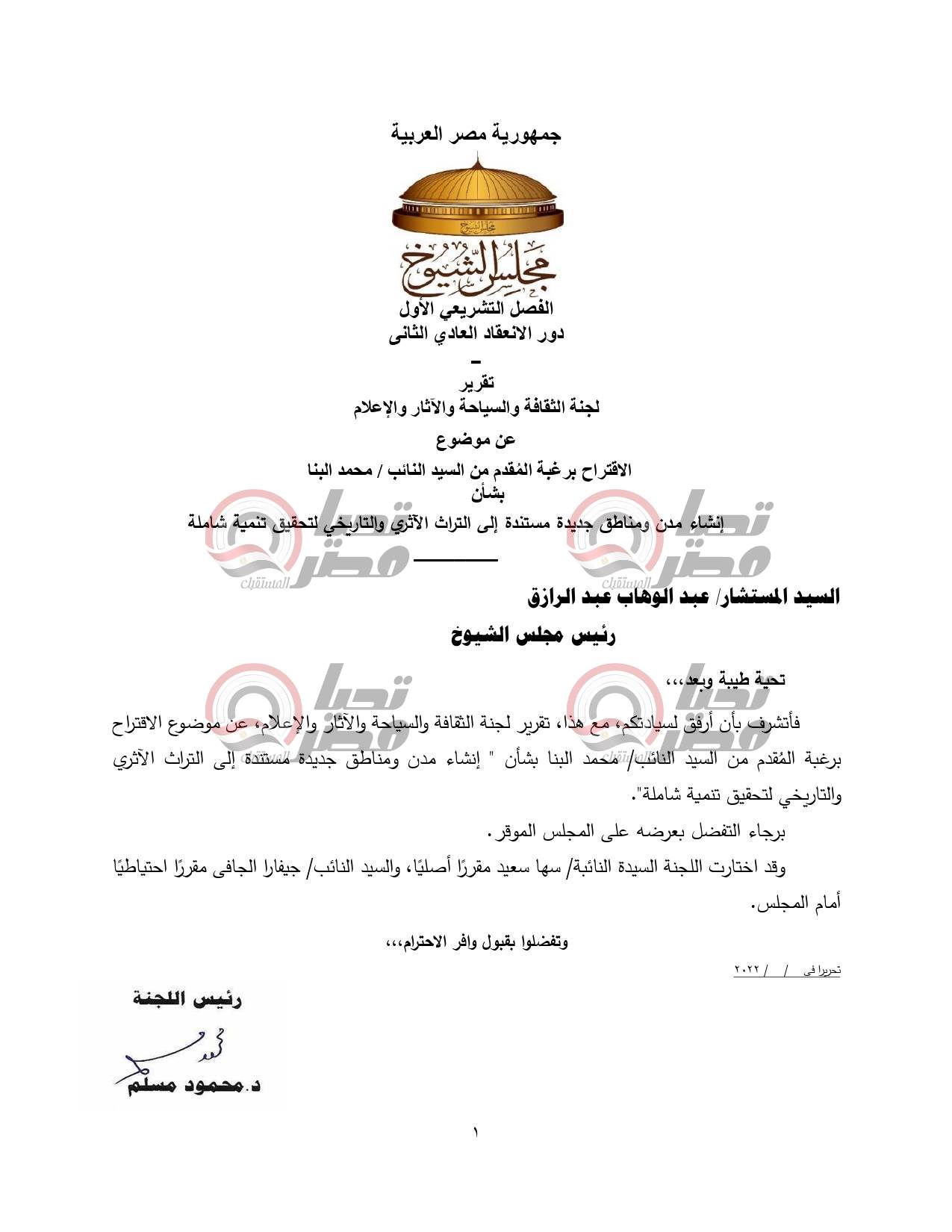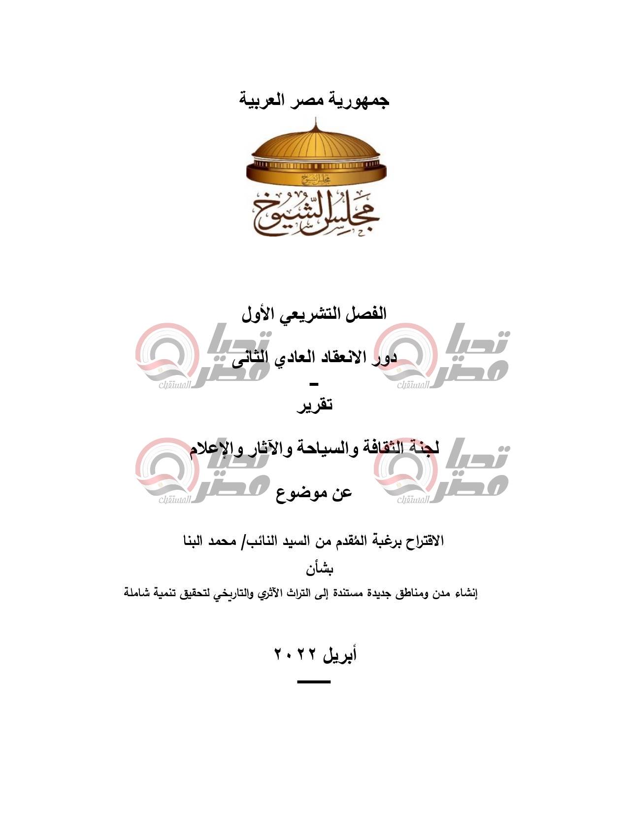 أحال مجلس الشيوخ، برئاسة المستشار عبد الوهاب عبد الرازق، خلال جلسته العامة اليوم، تقرير لجنة السياحة والآثار والثقافة والإعلام، عن الاقتراح برغبة المقدم من النائب محمد البنا، بشأن إنشاء مدن ومناطق جديدة مستندة إلى التراث الأثري والتاريخي لتحقيق تنمية شاملة.