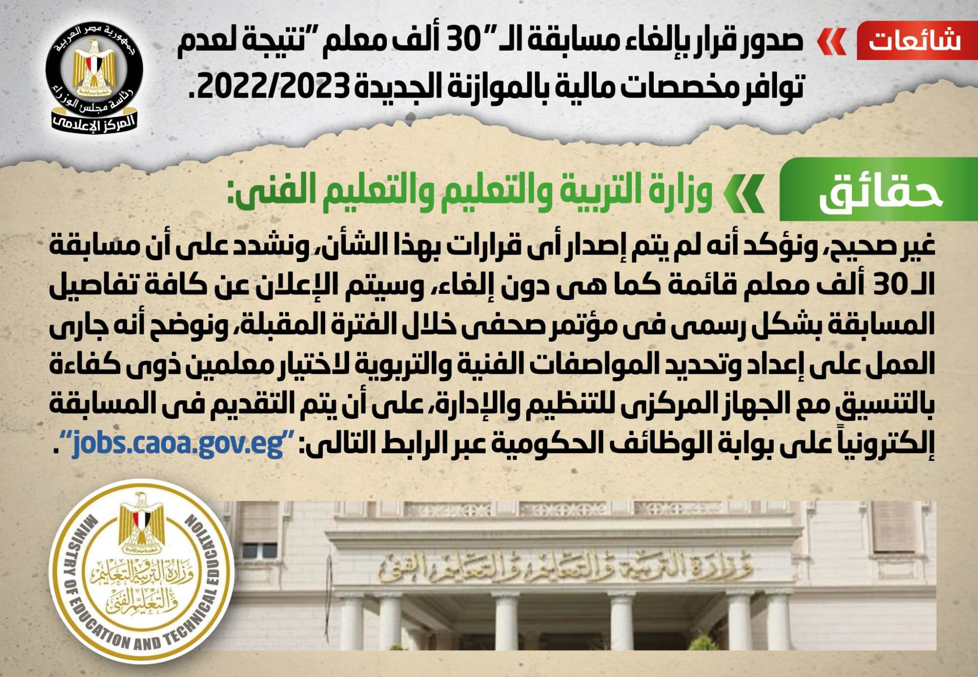وقام المركز الإعلامي لمجلس الوزراء، بالتواصل مع وزارة التربية والتعليم والتعليم الفني، والتي نفت تلك الأنباء، مُؤكدةً أنه لا صحة لإلغاء مسابقة الـ«30 ألف معلم» نتيجة لعدم توافر مخصصات مالية بالموازنة الجديدة 2022/2023، وأنه لم يتم إصدار أي قرارات بهذا الشأن، مُشددةً على أن مسابقة الـ 30 ألف معلم قائمة كما هي دون إلغاء، وسيتم الإعلان عن كافة تفاصيل المسابقة بشكل رسمي في مؤتمر صحفي خلال الفترة المقبلة، مُوضحةً أنه جاري العمل على إعداد وتحديد المواصفات الفنية والتربوية لاختيار معلمين ذوي كفاءة، بالتنسيق مع الجهاز المركزي للتنظيم والإدارة، على أن يتم التقديم في المسابقة إلكترونياً على بوابة الوظائف الحكومية عبر الرابط التالي: "jobs.caoa.gov.eg".