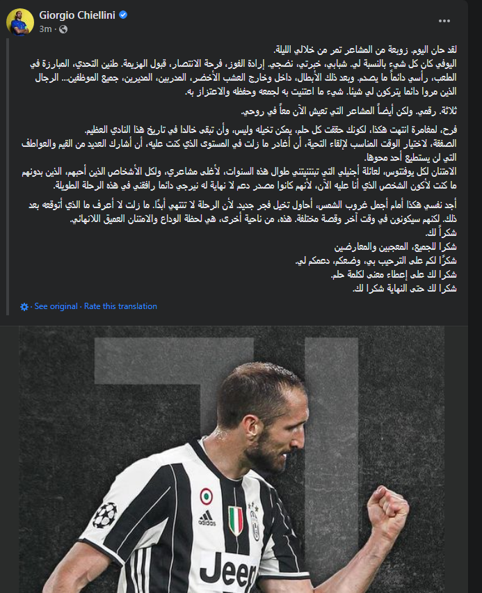 تأكد رحيل لاعب فريق يوفنتوس، الدولي الإيطالي جورجيو كيليني، عن "البيانكونيري"، بنهاية الموسم الجاري، ولن يجدد عقده مع "السيدة العجوز، حيث ودع اللاعب الجماهير برسالة مؤثرة.