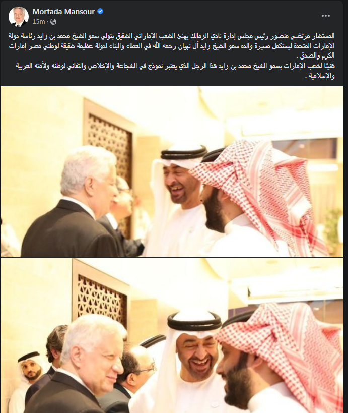 ونشر المستشار مرتضي منصور رئيس مجلس إدارة نادي الزمالك عبر حسابة الرسمي"فيس بوك": يهنئ الشعب الإماراتي الشقيق بتولي سمو الشيخ محمد بن زايد رئاسة دولة الإمارات المتحدة ليستكمل مسيرة والده سمو الشيخ زايد آل نهيان رحمه الله في العطاء والبناء لدولة عظيمة شقيقة لوطني مصر إمارات الكرم والصدق .
