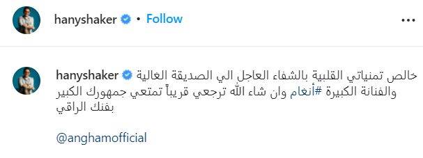 وعلق هاني شاكر على الصورة قائلًا: "خالص تمنياتي القلبية بالشفاء العاجل إلى الصديقة الغالية والفنانة الكبيرة أنغام وإن شاء الله ترجعي قريباً تمتعي جمهورك الكبير بفنك الراقي".