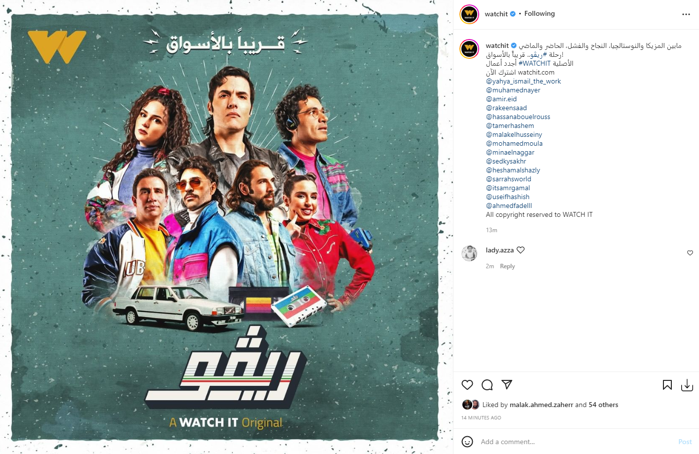 شاركت الصفحة الرسمية لمنصة واتش ات الرقمية بموقع التواصل الاجتماعي لتبادل الصور والفيديوهات “انستجرام”، متابعيها والجمهور، بنشر البوستر الرسمي لمسلسل ريفو الذي يضم فريق كايروكي والفنان حسن أبو الروس وعدد من النجوم.