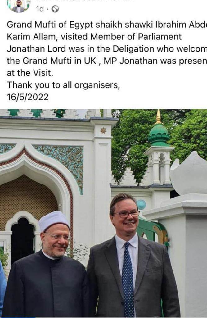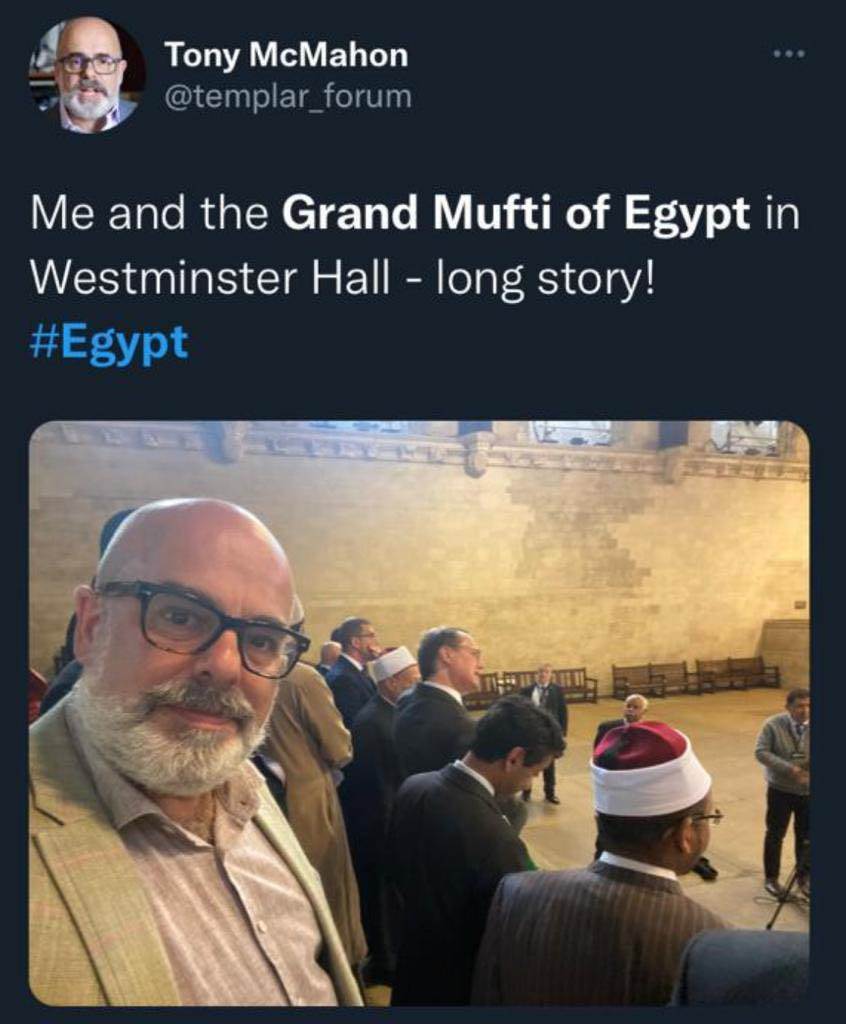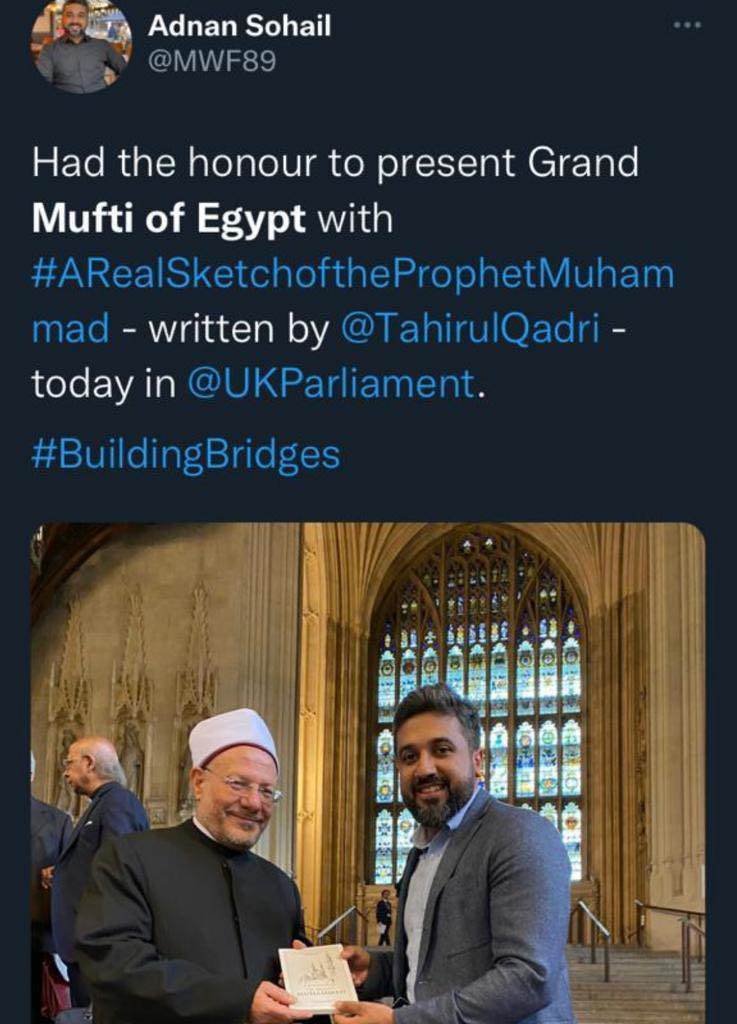 كما غرد اللورد طارق أحمد وزير الدولة بالخارجية البريطانية: "تشرفنا بلقاء الدكتور شوقي علام، مفتي مصر، الذي يزور المملكة المتحدة هذا الأسبوع واستقباله داخل مجلس العموم البريطاني. لقد التقيته في زيارتي الأخيرة إلى القاهرة وناقشت أولوياتنا المشتركة بشأن حرية الدين والمعتقد ومكافحة الإرهاب".