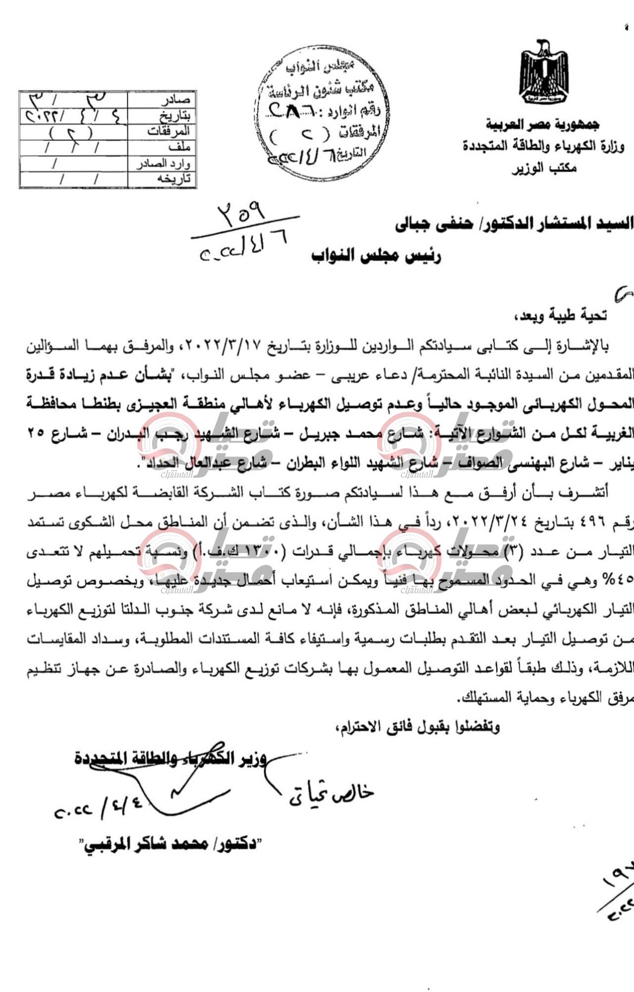 أكدت وزارة الكهرباء، من خلال كتـاب الشركة القابضة لكهربـاء مصر رقم ٤٩٦ بتاريخ ۲۰۲۲/۳/٢٤، والذي تضمن أن المناطق لبعض الشوارع بمنطقة العجيزي بطنطا، محل الشكوى تستمد التيـار مـن عـدد (۳) محولات كهرباء بإجمـالـي قـدرات (۱۳۰۰ ك.ف.أ) ونسبة تحمـيلهم لا تتعـدى E وهـي فـي الحـدود المسموح بها فنياً ويمكن استيعاب أحمال جديدة عليها.