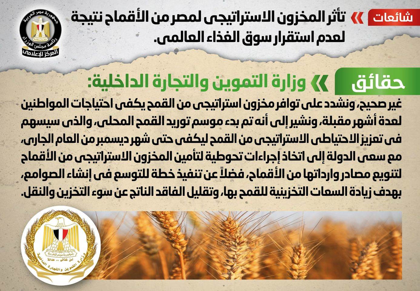 وأفاد المركز الإعلامي لمجلس الوزراء، اليوم الخميس، عبر صفحته الرسمية على موقع التواصل الاجتماعي «فيس بوك»، أنه قام بالتواصل مع وزارة التموين والتجارة الداخلية، والتي نفت تلك الأنباء، مُؤكدةً أنه لا صحة لتأثر المخزون الاستراتيجي لمصر من الأقماح نتيجة لعدم استقرار سوق الغذاء العالمي، مُشددةً على توافر مخزون استراتيجي من القمح يكفي احتياجات المواطنين لعدة أشهر مقبلة.