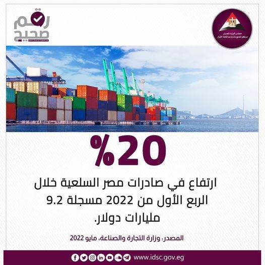 وقال مركز المعلومات ودعم اتخاذ القرار، إن صادرات مصر غير البترولية قد شهدت تحسنًا ملحوظًا خلال الربع الأول من 2022 لتسجل 9.2 مليارات دولار وبنسبة زيادة بلغت 20%.