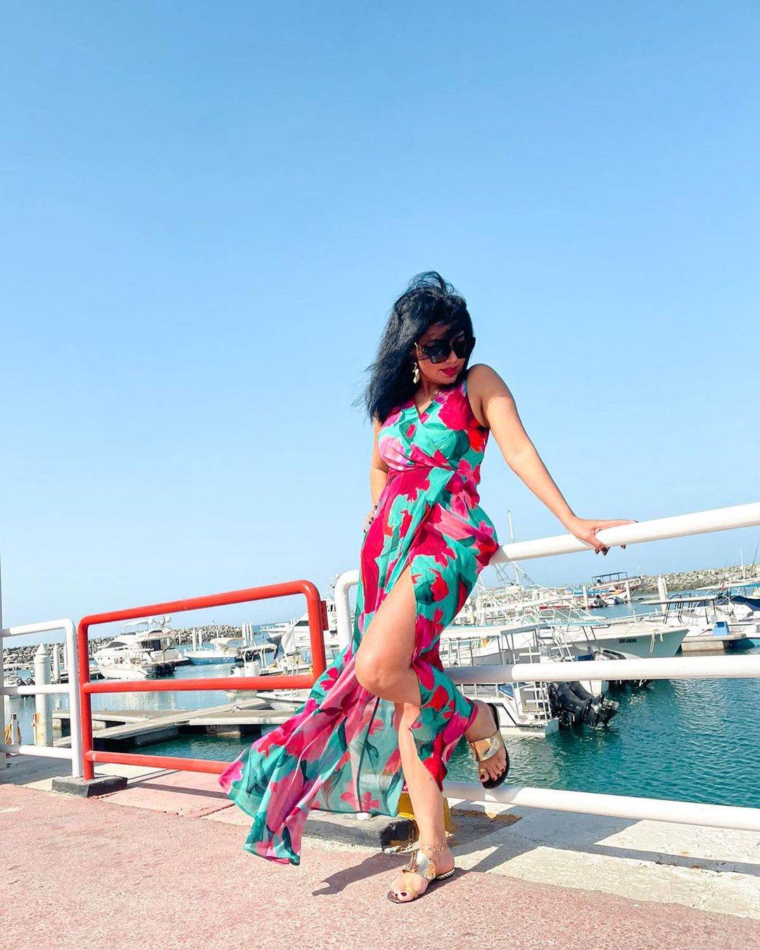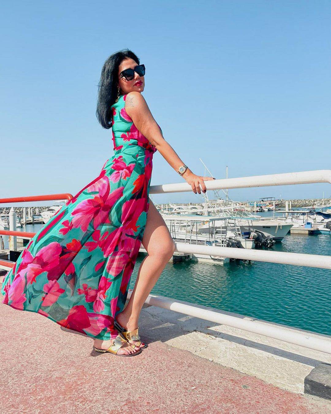 وظهرت رانيا يوسف في مجموعة صور شاركتها على موقع تبادل الصور والفيديوهات “انستجرام”، بفستان مشجر غلب عليه الللون الوردي أحد ألوانات الصيف المبجهة، وتعمدت رانيا يوسف على إظهار جزء كبير من قدمها رغم طول الفستان فضلا عن وضعيتها المثيرة في الصور.