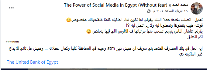 قال عميل بنك المصرف المتحد عبر صفحته بموقع "فيسبوك"،: "اتصلت بخدمة عملاء بنك المصرف المتحد بيقولي أما تكون قدام الماكينة كلمنا هنفتحهالك مخصوص".