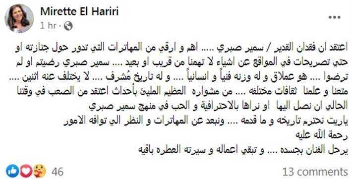 أوضحت ميريت الحريري ابنة الفنان الكبير عمر الحريري إن ما يحدث من تصريحات وتصرفات من قبل بعض الأشخاص عقب جنازة الراحل سمير صبري يغضب جميع محبيه، قائلة: "أعتقد أن فقدان القدير سمير صبري أهم وأرقي من المهاترات التي تدور حول جنازته”.