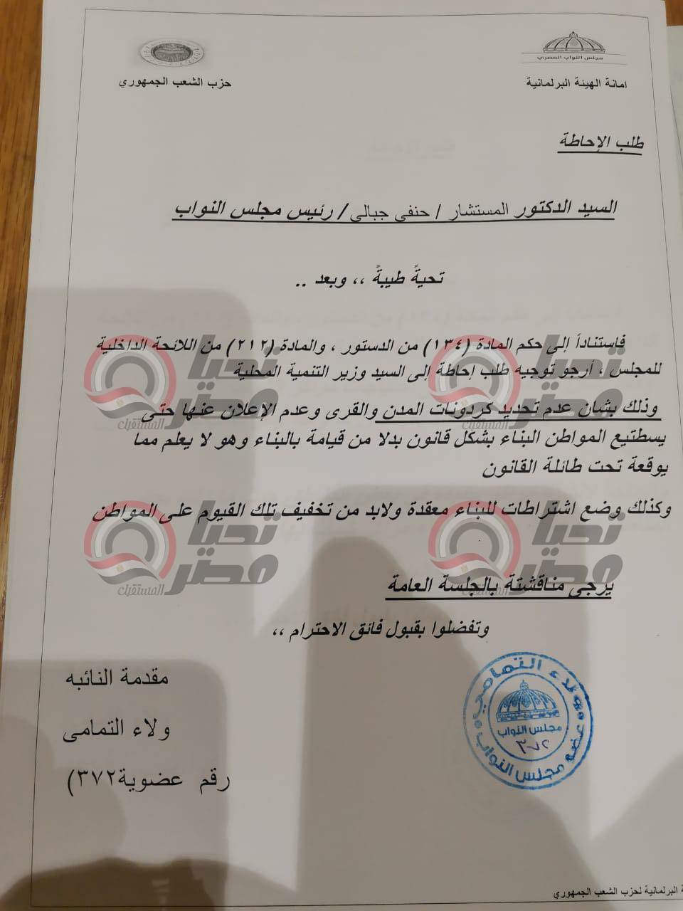 تقدمت النائبة ولاء التمامي عضو مجلس النواب، بطلب إحاطة للمستشار الدكتور حنفي جبالي رئيس مجلس النواب، موجة للدكتور اللواء محمود سيد عبد الحميد شعراوي، وزير التنمية المحلية ، علما بحكم المادة (134) من الدستور والمادة (212) من اللائحة الداخلية للمجلس.