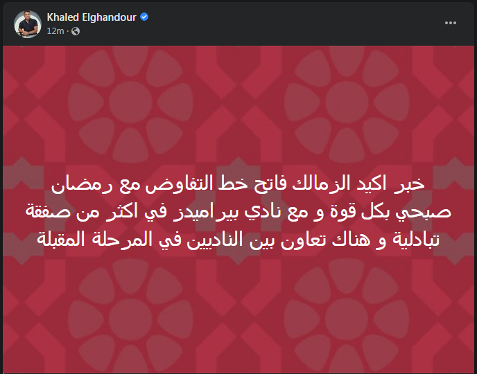 وكتب خالد الغندور عبر حسابة الرسمي"فيسبوك:" خبر اكيد الزمالك فاتح التفاوض مع رمضان صبحي بكل قوة ومع نادي بيراميدز فى اكثر من صفقة تبادلية وهناك تعاون بين الناديين فى المرحلة المقبلة".