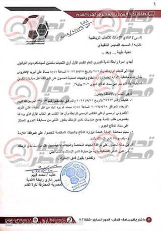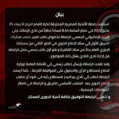 أعلنت رابطة الأندية المصرية المحترفة لكرة القدم ، أنها استلمت، اليوم الأربعاء 25 مايو 2022 في تمام الساعة 8.44 مساءاً خطاباً من نادي الزمالك على البريد الإلكتروني الرسمي للرابطة بخصوص طلب تغيير ملعب مباريات الفريق الأول إلى ستاد الدفاع الجوي في الدور الثاني من مسابقة الدوري العام بدلاً من ستاد القاهرة.