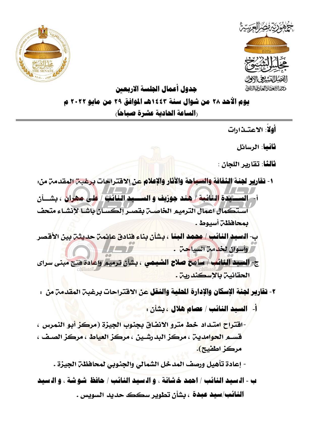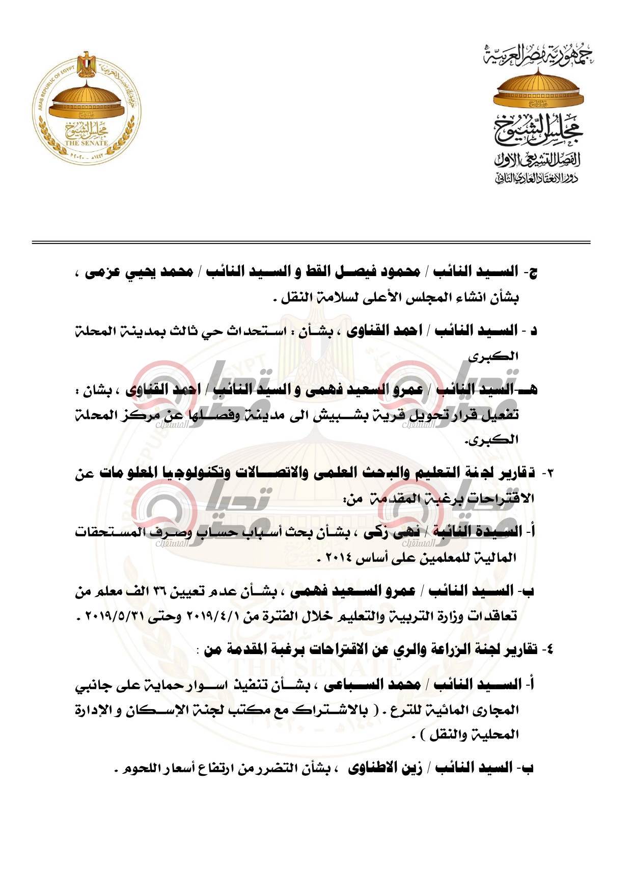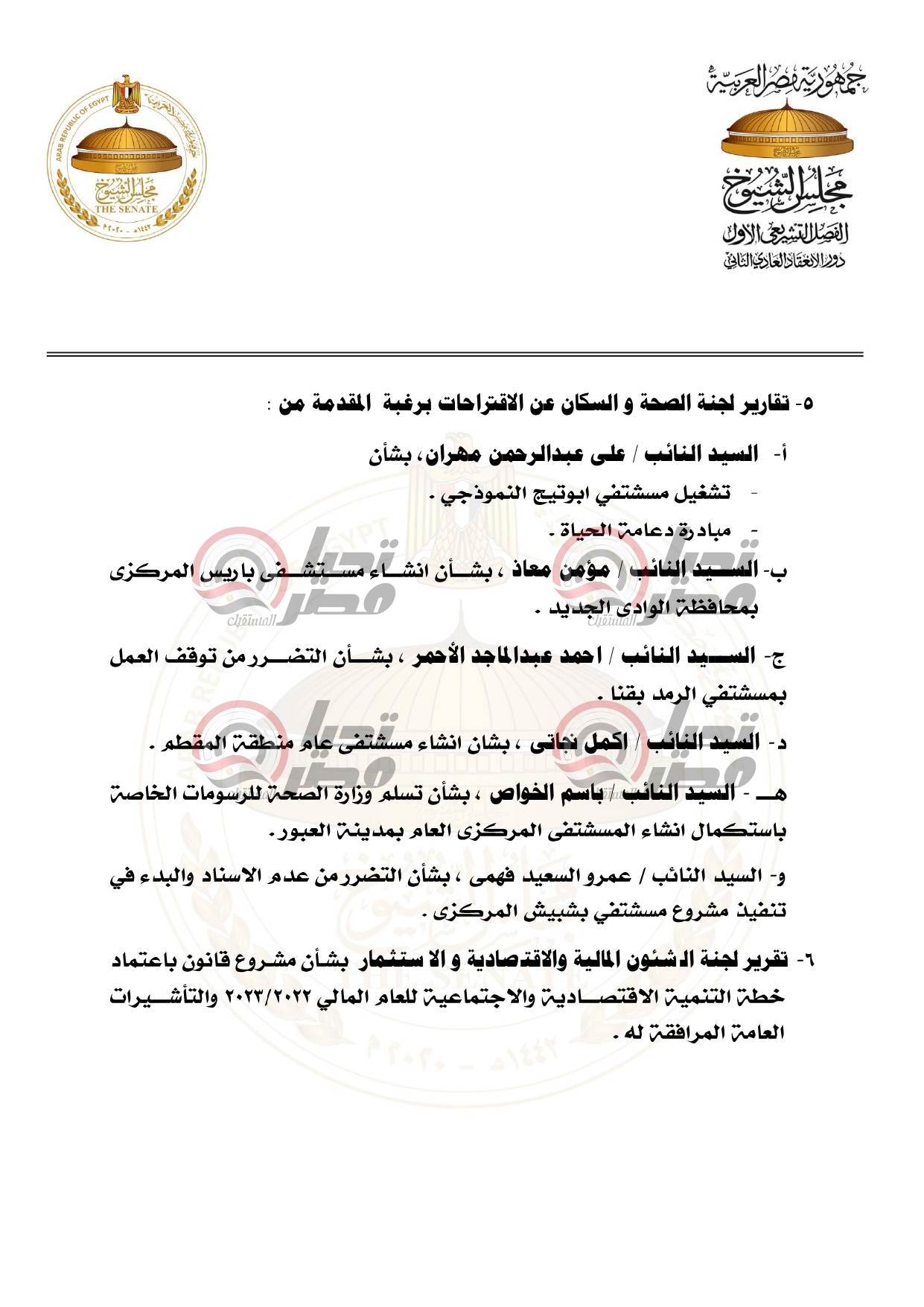كما تشهد الجلسة أيضا إحالة عدد من الإقتراحات المقدمة من الأعضاء إلى الحكومة والتى تمت مناقشتها باللجان النوعية بمجلس الشيوخ وتضم الاقتراحات برغبة المقدمة من النائب محمد السباعي ، بشـأن تنفيذ اسـوارحماية على جانبي المجارى المائية للترع (بالاشتراك مع مكتب لجنة الإسكان والإدارة المحلية والنقل ومن النائب زين الاطناوي، بشأن التضرر من ارتفاع أسعار اللحوم.