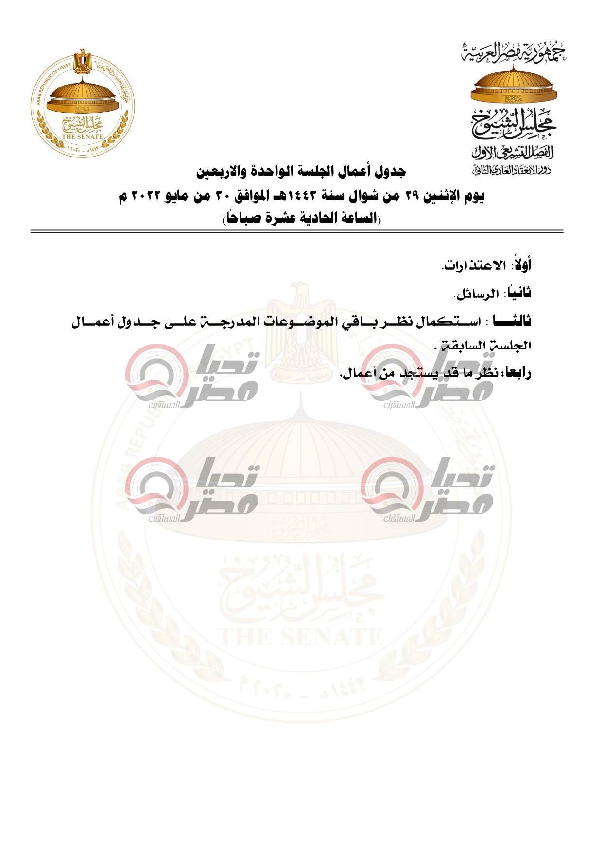 تشهد جلسات مجلس الشيوخ برئاسة المستشار عبد الوهاب عبد الرازق، يومى الأحد والاثنين نظر تقرير لجنة الشئون المالية بشأن خطة التنمية للعام المالى 2022- 2023 وأيضا مشروع قانون النائب أشرف رشاد الشريف المحال من مجلس النواب بشأن صندوق قادرون بإختلاف.