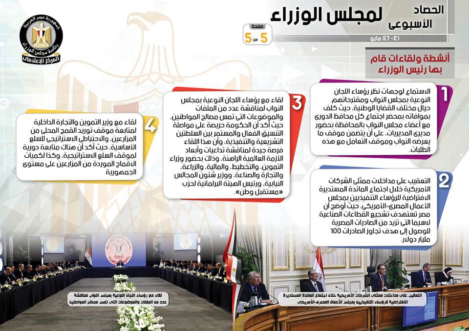 نشر المركز الإعلامي لمجلس الوزراء، تقريراً شمل انفوجرافات سلط من خلالها الضوء على الحصاد الأسبوعي لمجلس الوزراء، وذلك خلال الفترة من 21 حتى 27 مايو 2022، والذي تضمن الموافقة على عدد من القرارات، فضلاً عن الاجتماعات واللقاءات التي عقدها الدكتور مصطفى مدبولي، رئيس مجلس الوزراء، بالإضافة إلى ما قام به سيادته من أنشطة.