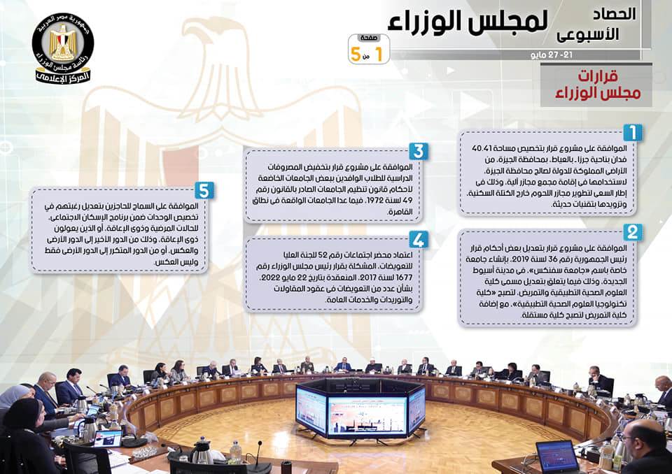 وجاء في التقرير أنه تم إصدار عدد من القرارات، تشمل قراراً بالموافقة على مشروع قرار بتخصيص مساحة 40.41 فدان بناحية جرزا ـ بالعياط، بمحافظة الجيزة، من الأراضي المملوكة للدولة لصالح محافظة الجيزة، لاستخدامها في إقامة مجمع مجازر آلية، وذلك في إطار السعي لتطوير مجازر اللحوم خارج الكتلة السكنية، وتزويدها بتقنيات حديثة، فضلاً عن الموافقة على مشروع قرار بتعديل بعض أحكام قرار رئيس الجمهورية رقم 36 لسنة 2019، بإنشاء جامعة خاصة باسم "جامعة سفنكس"، في مدينة أسيوط الجديدة، وذلك فيما يتعلق بتعديل مسمى كلية العلوم الصحية التطبيقية والتمريض، لتصبح "كلية تكنولوجيا العلوم الصحية التطبيقية"، مع إضافة كلية التمريض لتصبح كلية مستقلة، بالإضافة إلى الموافقة على مشروع قرار بتخفيض المصروفات الدراسية للطلاب الوافدين ببعض الجامعات الخاضعة لأحكام قانون تنظيم الجامعات الصادر بالقانون رقم 49 لسنة 1972، فيما عدا الجامعات الواقعة في نطاق القاهرة، كما تم اعتماد محضر اجتماعات رقم 52 للجنة العليا للتعويضات، المشكلة بقرار رئيس مجلس الوزراء رقم 1677 لسنة 2017، المنعقدة بتاريخ 22 مايو 2022، بشأن عدد من التعويضات في عقود المقاولات والتوريدات والخدمات العامة.