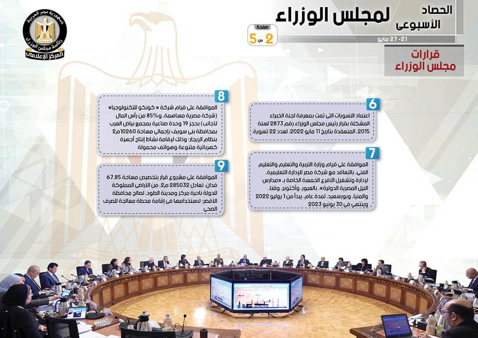 كما تضمنت القرارات أيضاً، كما جاء بالتقرير، الموافقة على السماح للحاجزين بتعديل رغبتهم في تخصيص الوحدات ضمن برنامج الإسكان الاجتماعي، للحالات المرضية وذوى الإعاقة، أو الذين يعولون ذوى الإعاقة، وذلك من الدور الأخير إلى الدور الأرضي والعكس، أو من الدور المتكرر إلى الدور الأرضي فقط وليس العكس، وكذلك اعتماد التسويات التي تمت بمعرفة لجنة الخبراء المشكلة بقرار رئيس مجلس الوزراء رقم 2873 لسنة 2015، المنعقدة بتاريخ 11 مايو 2022، لعدد 22 تسوية، وكذلك الموافقة على قيام وزارة التربية والتعليم الفني، بالتعاقد مع شركة مصر للإدارة التعليمية، لإدارة وتشغيل الأفرع الخمسة الخاصة بـ "مدارس النيل المصرية الدولية"، بالعبور، وأكتوبر، وقنا، والمنيا، وبورسعيد، لمدة عام، يبدأ من 1 يوليو 2022 وينتهي في 30 يونيو 2023، في حين تمت الموافقة على قيام شركة " كونكو للتكنولوجيا" (شركة مصرية مساهمة، و85% من رأس المال لأجانب) بحجز 19 وحدة صناعية بمجمع بياض العرب بمحافظة بنى سويف بإجمالي مساحة 10260م2 بنظام الإيجار؛ وذلك لإقامة نشاط إنتاج أجهزة كهربائية متنوعة وهواتف محمولة، بجانب الموافقة على مشروع قرار بتخصيص مساحة 67,85 فدان، تعادل 285032 م2، من الأراضي المملوكة للدولة ناحية مركز ومدينة الطود، لصالح محافظة الأقصر؛ لاستخدامها في إقامة محطة معالجة للصرف الصحي.