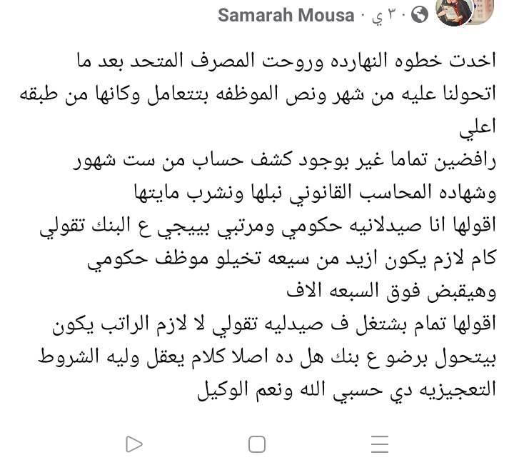 قالت عميلة بنك المصرف المتحد عبر صفحتها على موقع "فيسبوك"؛ :أخدت خطوة النهاردة وروحت المصرف المتحد بعد ما اتحولنا عليه من شهر ونص الموظفة بتتعامل وكأنها من طبقة أعلي".