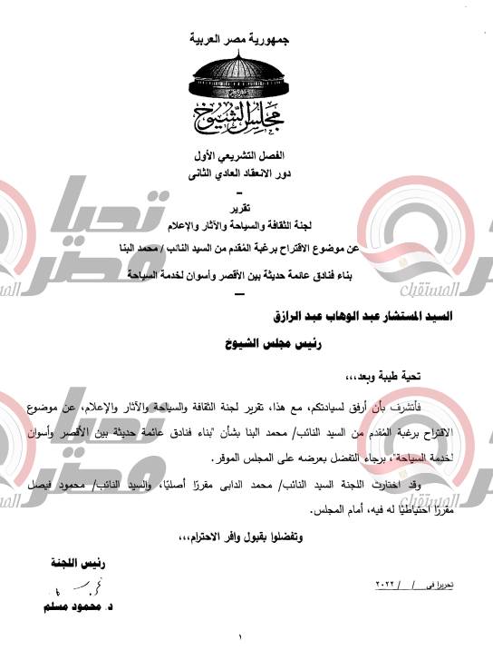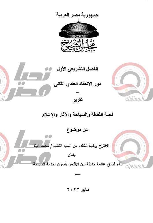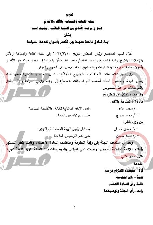 أحال مجلس الشيوخ، برئاسة المستشار عبد الوهاب عبد الرازق، خلال جلسته العامة اليوم، تقرير لجنة الثقافة والسياحة والاثار والإعلام، عن الاقتراح برغبة المقدم من النائب محمد البنا، بشأن بناء فنادق عائمة حديثة بين الأقصر وأسوان لخدمة السياحة، للحكومة لاتخاذ ما تراه مناسب.