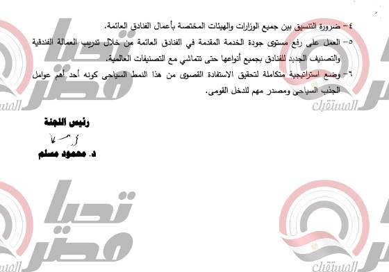 5- العمل على رفع مستوى جودة الخدمة المقدمة في الفنادق العائمة من خلال تدريب العمالة الفندقية والتصنيف الجديد للفنادق بجميع أنواعها حتى تتماشي مع التصنيفات العالمية .