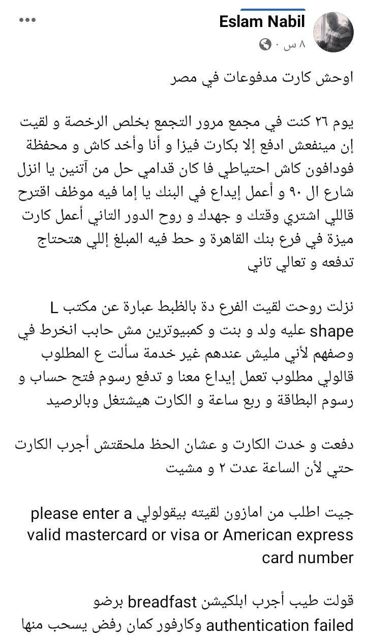 وتابع: "جيت اطلب من امازون لقيته بيقولولي please enter a valid mastercard or visa or American express card number قولت طيب أجرب ابلكيشن breadfast برضو authentication failed وكارفور كمان رفض يسحب منها not supported فا كلمتهم قولت فيه مشكلة في الاونلاين بافتراض حسن النية ردوا إن لا دة الكارت دة شغال أونلاين و أوفلاين قولتلها إزاي حضرتك منا قدامك جربت ثلاث خدمات نص البلد بتستخدمهم ومش راضي يسحب فا طمنتني إن أكيد دة ظرف عارض وحاجة بسيطة وأنا اتطمنت".