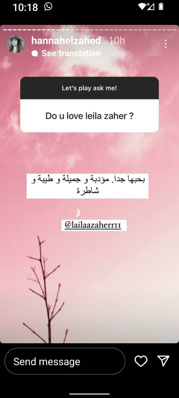 وتابعت: “بحب ليلى أحمد زاهر جدًا ومؤدبة وجميلة وطيبة وشاطرة.. قابلتها مرة واحدة في حياتي وكانت جميلة ولذيذة وعلطلول بقينا صحاب وعملنا لبعض فولو”.
