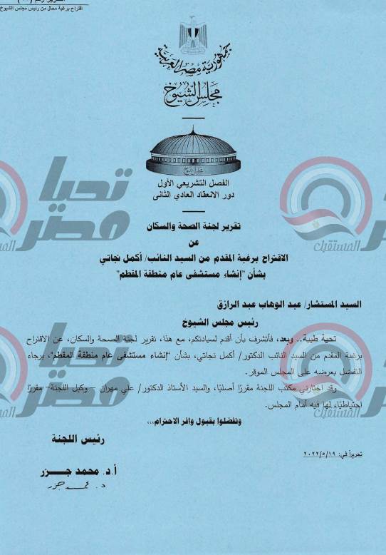حيث أحال مجلس الشيوخ، برئاسة المستشار عبد الوهاب عبد الرازق، تقرير اللجنة، عن الاقتراح برغبة المقدم من النائب أكمل نجاتي، عضو تنسيقية شباب الأحزاب والسياسيين، بشأن" إنشاء مستشفي عام بمنطقة المقطم"، للحكومة لاتخاذ ما تراه مناسب.