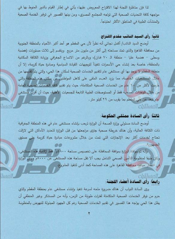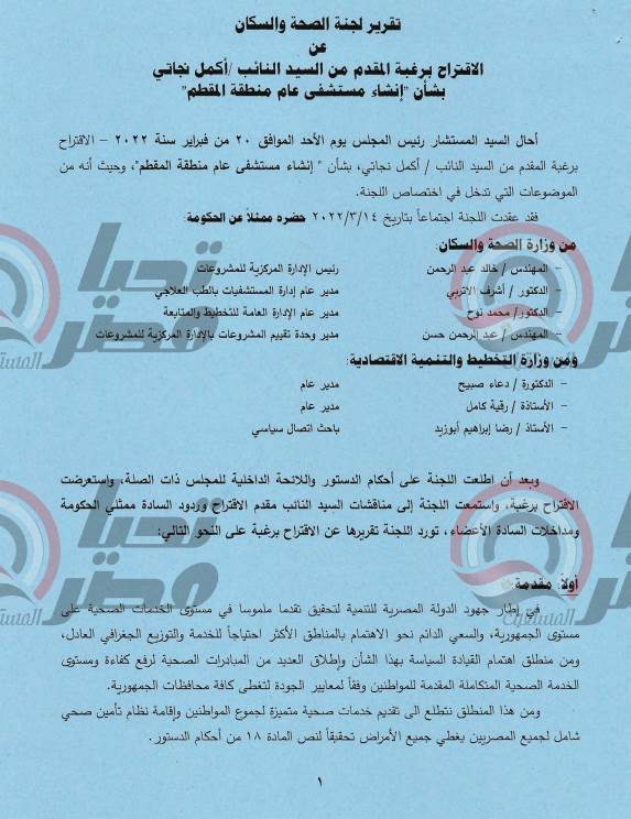 أوصت لجنة الصحة والسكان، فى تقريرها عن الاقتراح برغبة المقدم من النائب أكمل نجاتي، عضو تنسيقية شباب الأحزاب والسياسيين، بشأن" إنشاء مستشفي عام بمنطقة المقطم"، بتخصيص محافظة القاهرة قطعة أرض أملاك دولة بمساحة 8000 م ٢ وذلك كحد أدنى لإنشاء مستشفى المقطم العام وفقاً للاشتراطات الجديدة التي تتماشى مع منظومة التأمين الصحي الشامل، على أن تتكفل وزارة الصحة بإنشاء المستشفي طبقاً للمعايير الفنية المحددة، على أن يتم إدراج الموضوع ضمن الأولويات العاجلة بخطة وزارة الصحة والسكان وتوفير المخصصات المالية من خلال وزارة المالية، وإفادة اللجنة بذلك في أسرع وقت حتى يتسنى للجنة متابعة ما تم في هذا الشأن .